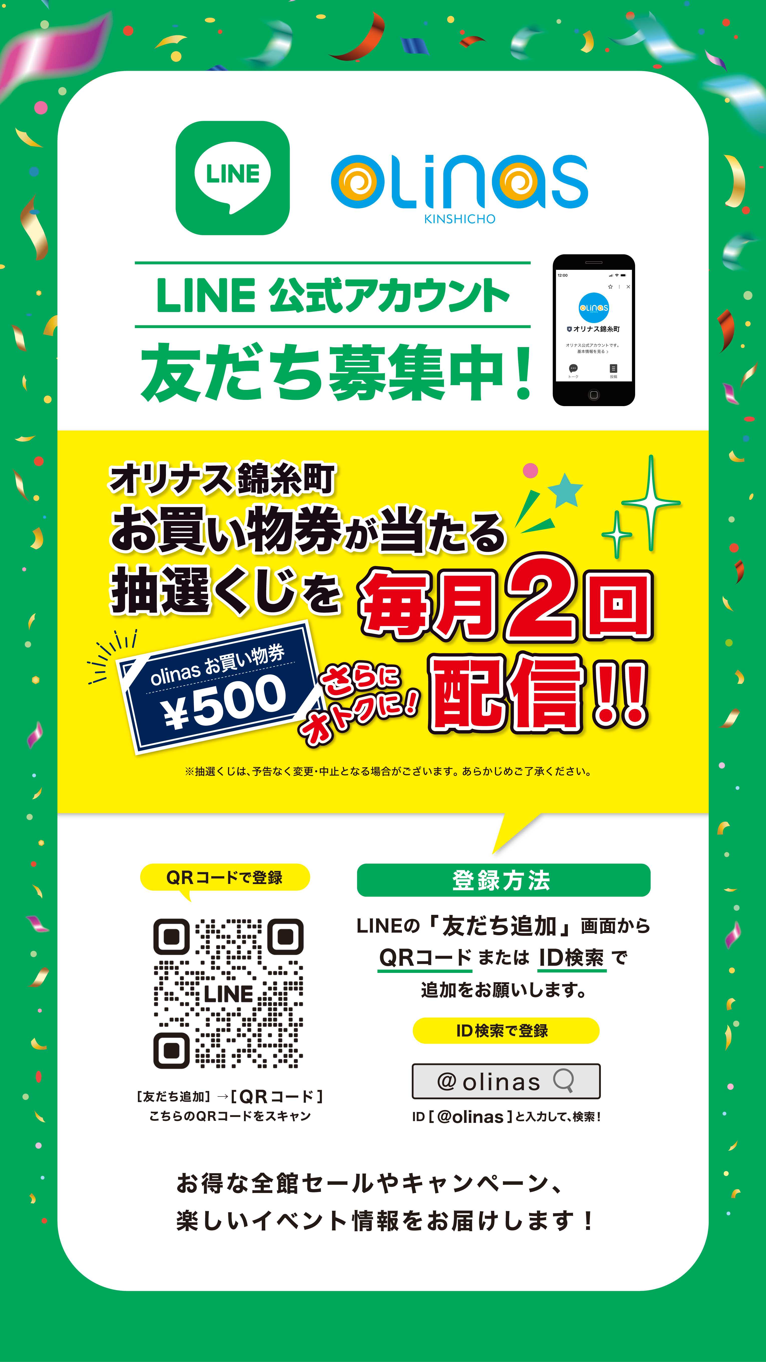 LINE友だちに登録いただくと、「オリナス錦糸町 お買物券」が当たる抽選くじを毎月2回配信しております。